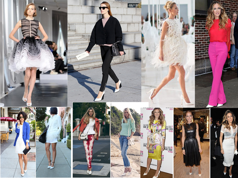 Preconceitos à parte, os sapatos brancos ganharam os pés das famosas mais estilosas do hemisfério norte. Em escarpins, peep-toes e sandálias, o branco se firma como o neutro da vez. As combinações possíveis são numerosas: fica uma graça com roupas de tons claros, faz um contaste legal com roupas escuras e ainda há o - estiloso, porém perigoso - campo do look todo branco, da cabeça aos pés.